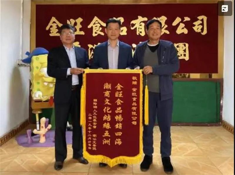 潮人文化基金会执行董事长温少明先生、荣誉董事长林继宗先生向我司(金旺食品)董事长赠送“金旺食品畅销四海潮商文化结缘五洲”的锦旗,以表示基金会对我司多年以来大力支持的感谢之情。