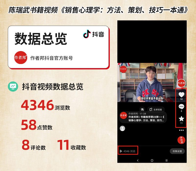 陈瑞武老师的书籍推荐视频《销售心理学:方法、策划、技巧一本通》,上线做作者邦网抖音官方账号等渠道,收获了破4000次浏览、获赞58次的好成绩。日前,数据还在持续提升当中。