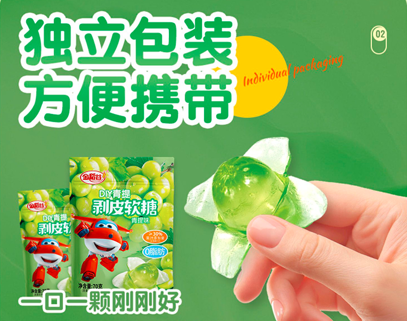 金稻谷出品,‘剥皮葡萄果汁软糖’果汁添加,软糯弹牙,独立包装,全网火爆销售,自己手工DIY剥皮,仿真葡萄,带给你一场不一样的视觉盛宴,还有超级飞侠正版IP授权哦。