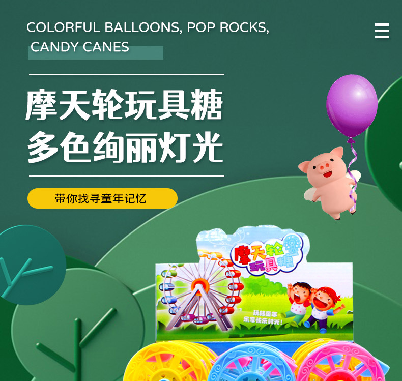 摩天轮玩具糖,多色绚丽灯光,带你寻找童年的记忆,很好的锻炼孩子手眼协调能力和反应能力,在吃零食的同时,更好的开发智力。亲子互动游戏,体现孩子的观察能力。