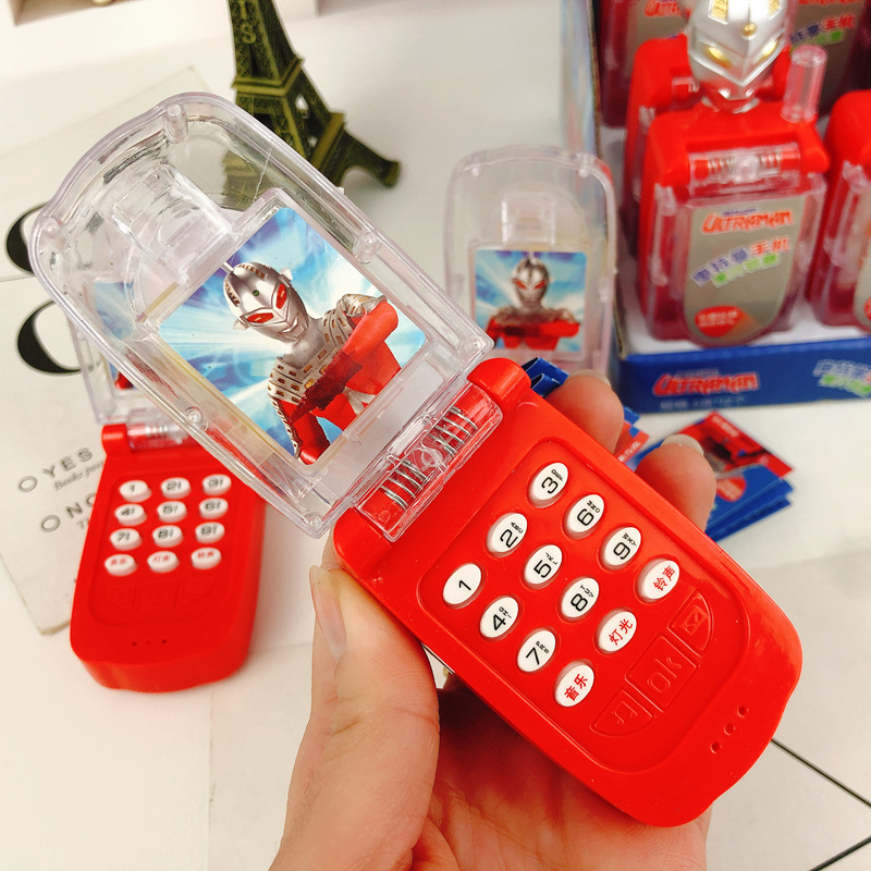 奥特曼玩具手机,经典奥特曼图样,仿真现实手机造型,带有音乐和灯光效果,按动按键上的按钮即可操作,简单易懂,盒内还有精美的果汁软糖,拿出来即可品尝美味。