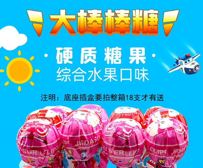 大棒棒糖,硬质糖果,综合水果口味,‘众生皆苦,草莓味’,‘有你的每一天氧气都变成了橙子’,‘牛顿发现了万有引力而你比他更懂苹果味’,‘不吃葡萄也能尝到葡萄的酸甜’。