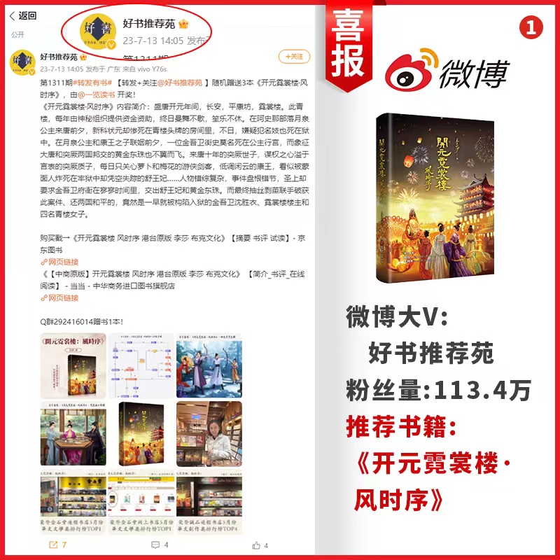 李莎老师创作的书籍著作《开元霓裳楼:风时序》在全网获得热销,得到了众多百万粉丝微博大V所倾力推荐,尽显其作品实力和内容魅力。极大地提升了这部作品的品牌价值与独特魅力。