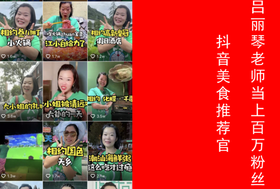 吕丽琴老师已当上了抖音号的美食推荐类博主,为广大观众送上了许多别具风味的美食佳肴。同时,她更以自己独特的人设和博主风格,赢得了百万粉丝的关注与赞扬。
