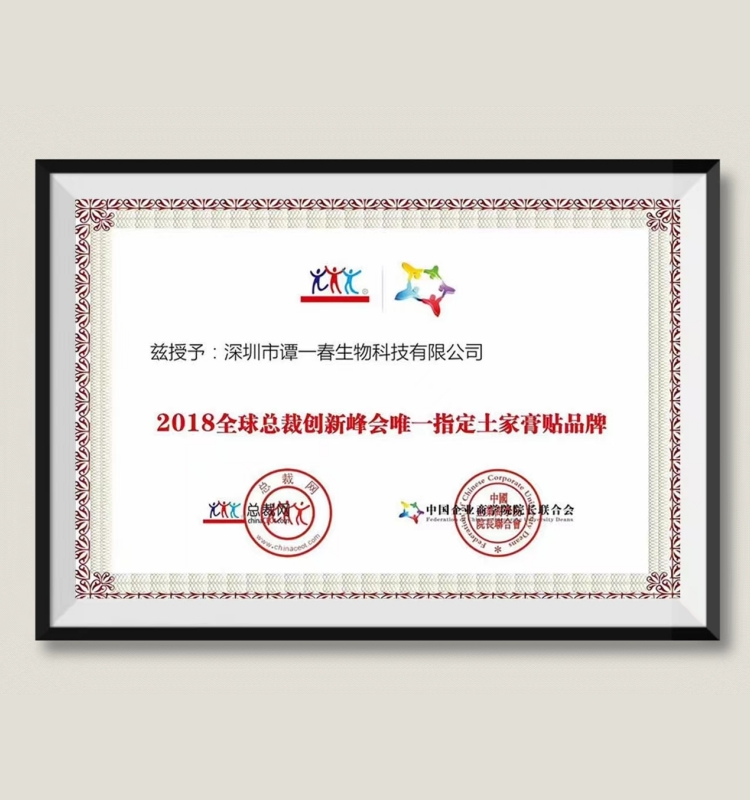 产品知名度日益提高,产品功效得到了患者的广泛认可,深圳市谭一春生物科技有限公司,被授予2018全球总裁创新峰会唯一指定土家膏贴品牌,由总裁网、中国企业商学院院长颁发荣誉证书。