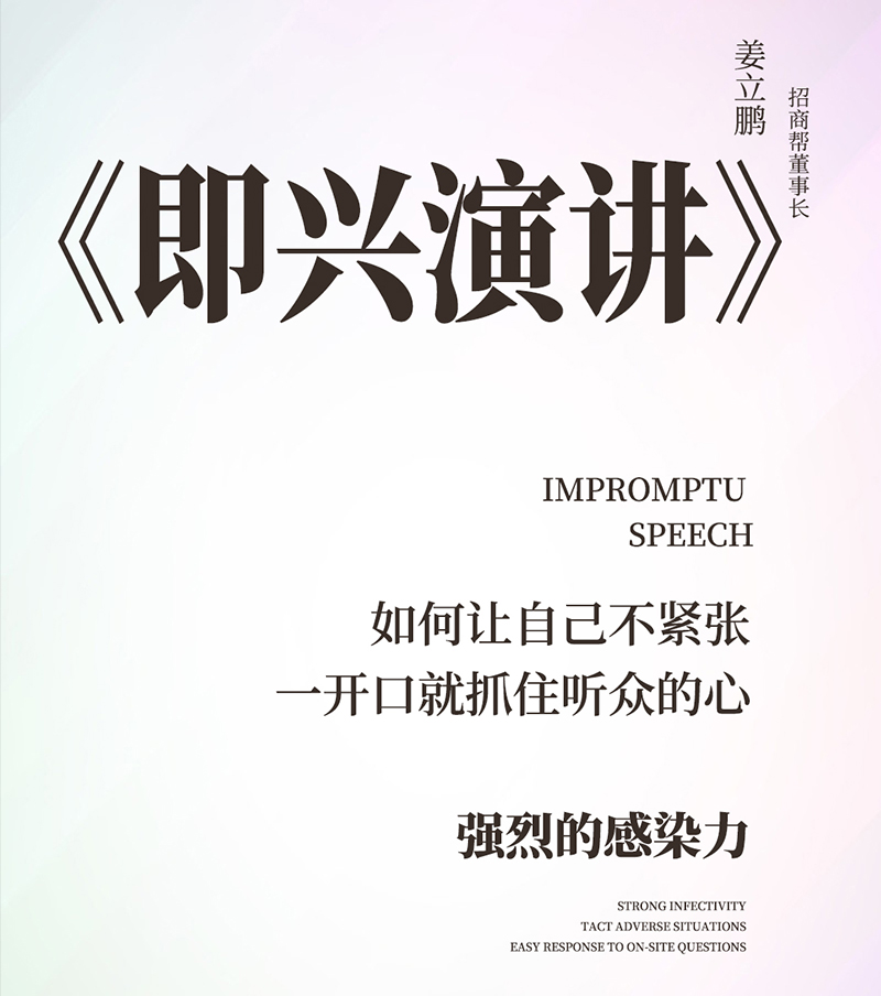招商帮集团董事长姜立鹏老师——作品《即兴演讲》预热,机智应对不利局面,三个方法选择主题,四步搞定演讲框架,仔细打磨你的遣词用句,运用自在得体的肢体语言说服那你的听众。
