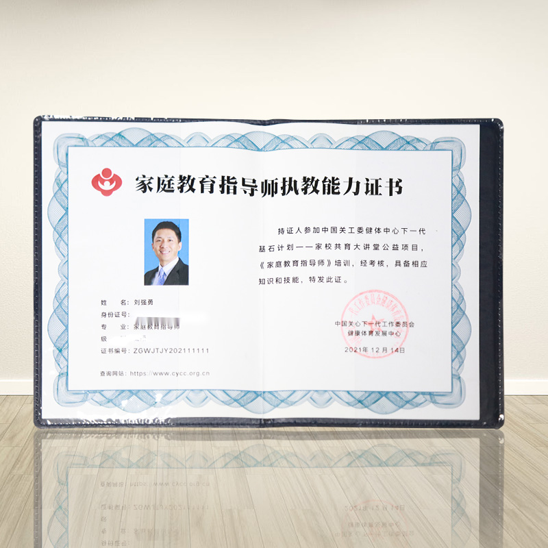 刘景斓老师参加中国关工委健体中心下一代基石计划——家校共育大讲堂公益项目,通过了《家庭教育指导师》培训,考核合格,工作委员会健体中心下发”家庭教育指导师执教能力证书“