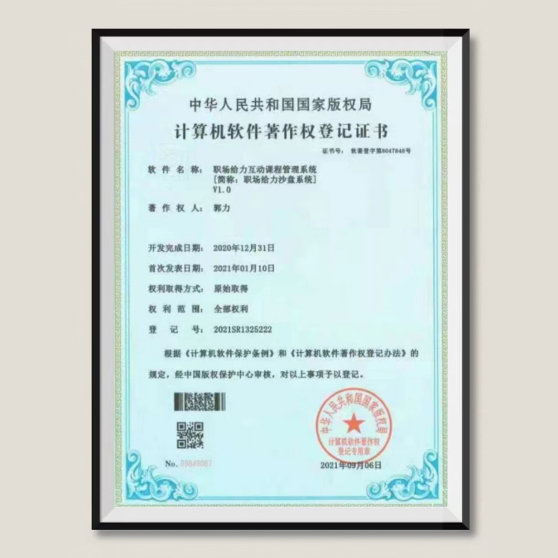 郭力老师给自己研发的【职场给力沙盘系统】,经过中华人民共和国国家版权局审核认定,郭老师拥有课程系统的全部权利,并予以登记在案,获得计算机软件著作权登记证书。