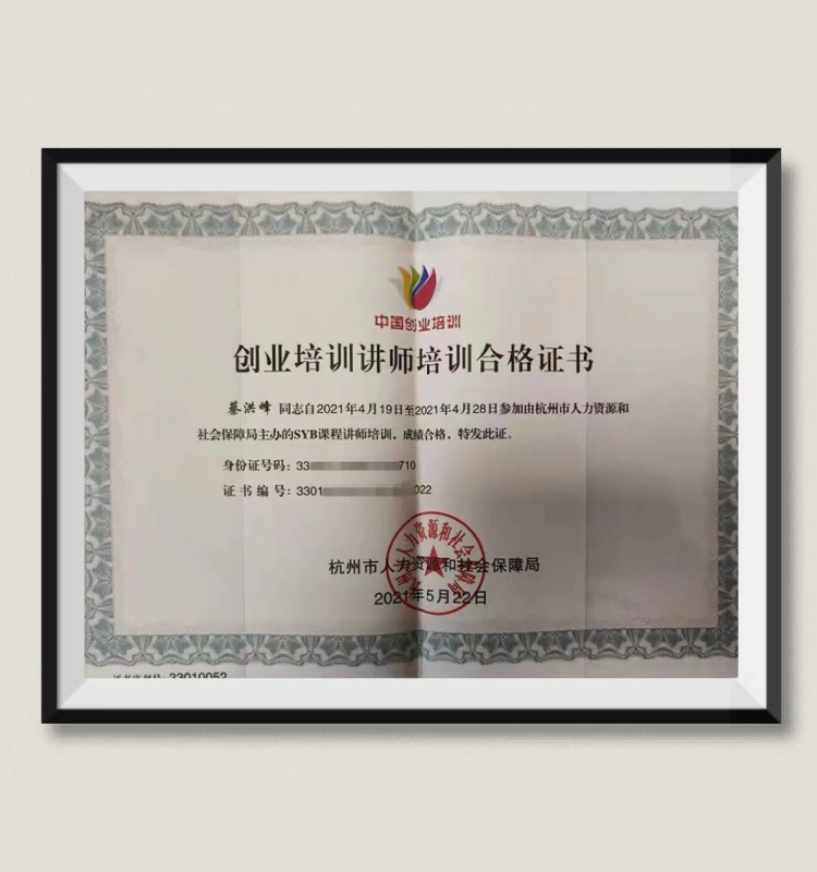 蔡洪峰老师自2021年4月19日至2021年4月8日参加由杭州市人力资源和社会保障局主办的SYB课程讲师培训,成绩优异,评定合格,荣获“创业培训讲师培训合格证书”。