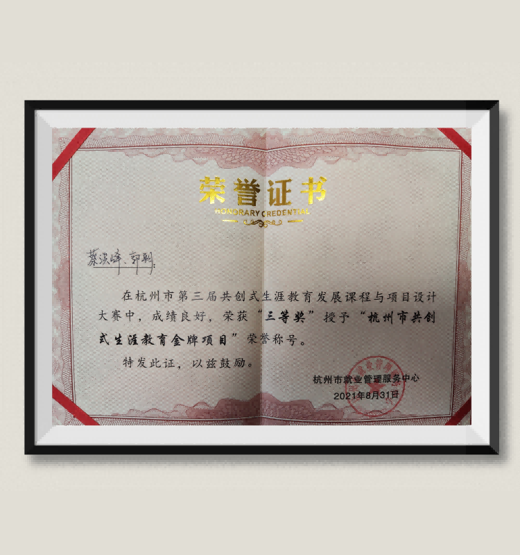 蔡洪峰老师在参加第四届杭州市共创式生涯教育发展课程与项目设计大赛中表现突出,荣获“杭州市共创式生涯教育金牌项目”奖项,由杭州市就业管理服务中心颁发荣誉证书。