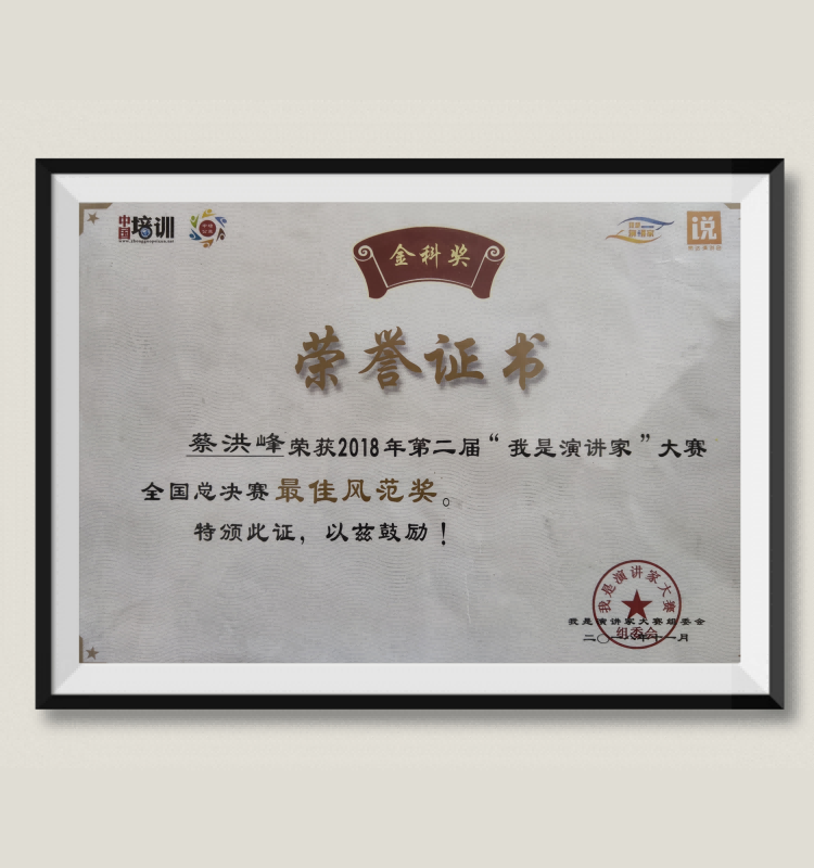 蔡洪峰老师参加“我是演讲家”大赛,在比赛中凭借过硬的实力与精彩的演讲,得到评委极高的评价,荣获2018年第二届“我是演讲家”大赛全国总决赛“最佳风范奖”。