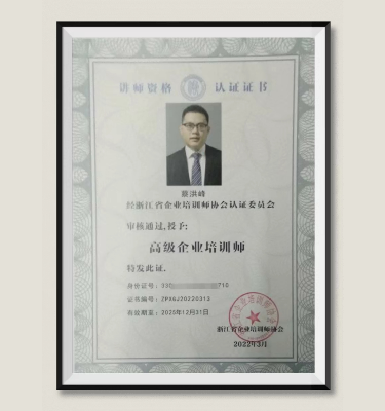 蔡洪峰老师在企业培训领域优异的表现与突出的成就,经浙江省企业培训师协会认证委员会认证,审核通过荣获——“高级企业培训师”讲师资格认证证书。