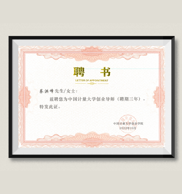 蔡洪峰老师的专业实力与多年的创业指导工作经验,一直以来受到多家企业与高校的欢迎,此次中国计量大学创业学院特聘请蔡洪峰老师为——“中国计量大学创业导师”。