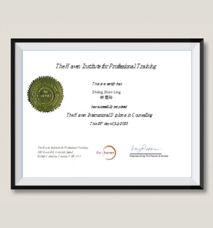 加拿大HAVEN认证国际心理咨询师;国家二级心理咨询师;国际EAP协会(EAPA)认证企业 EAP执行师;NLP神经语言学专业执行师