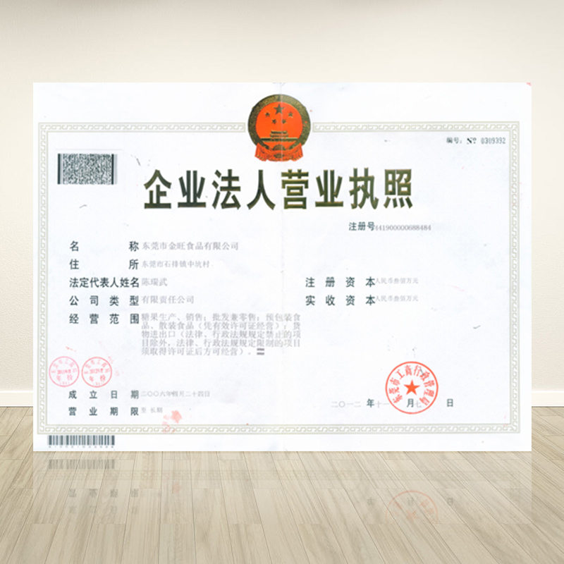 金旺食品有限公司,经过自行检验方式,通过审查,糖果制品符合食品生产许可证发证条件,由广东省东莞市质量技术监督局,下发《全国工业产品生产许可证》