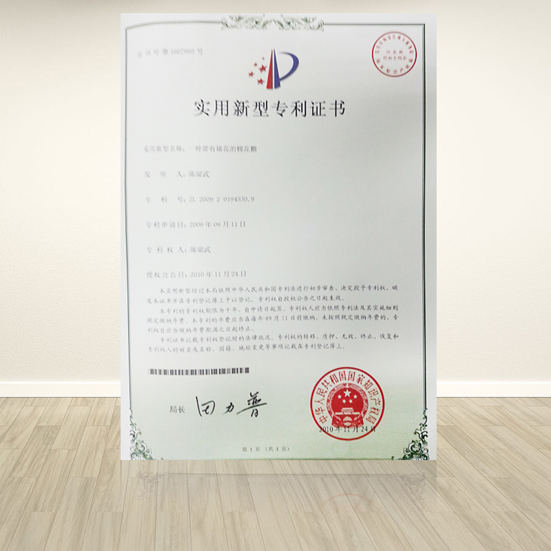 金旺食品有限公司,研发创新设计糖果外观:一种带有裱花的棉花糖,设计新奇美观,获得中华人民共和国国家知识产权局下发的——《外观设计专利证书》