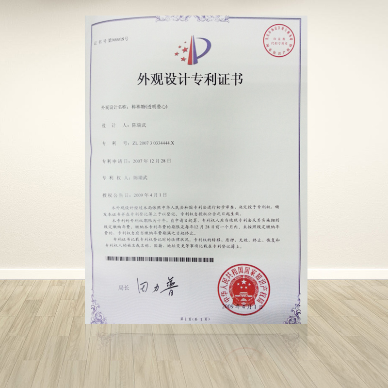 金旺食品有限公司,研发设计棒棒糖外观,透明叠心棒棒糖,设计独特,造型新颖,获得中华人民共和国国家知识产权局下发的——《外观设计专利证书》