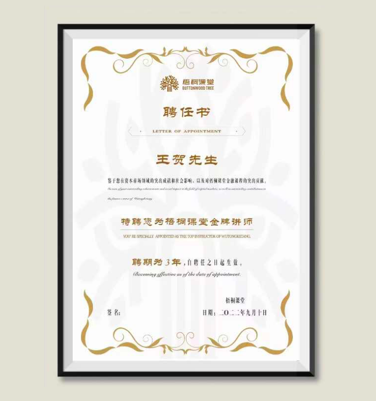 梧桐课堂2022年9月10日聘请王贺老师作为梧桐课堂金牌讲师。旨在将王贺老师的专业知识与梧桐课堂的教学理念相结合,共同为广大学员提供更高质量的教育服务,聘期长达三年。