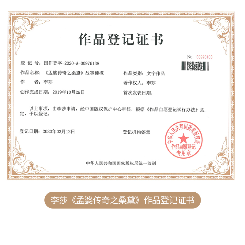 畅销书作家李莎老师文字作品——《孟婆传奇》,作品登记证书由李莎老师申请,经中国版权保护中心审核,根据《作者自愿登记试行办法》规定,予以登记,由中华人民共和国国家版权局下发证书。