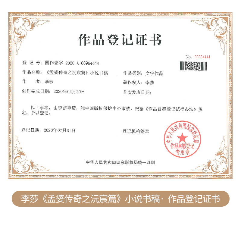 畅销书作家李莎老师文字作品——《孟婆沅宸》由李莎老师申请,经中国版权保护中心审核,根据《作者自愿登记试行办法》规定,予以登记,发表出品。
