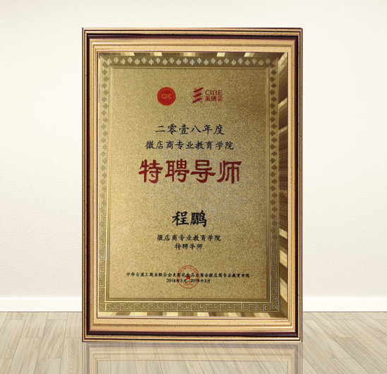 中国人性智慧学终生推动者:程鹏,获得了由CIBE美博会认证的,2018年度微店商专业教育学院颁发的“特聘导师”荣誉称号。