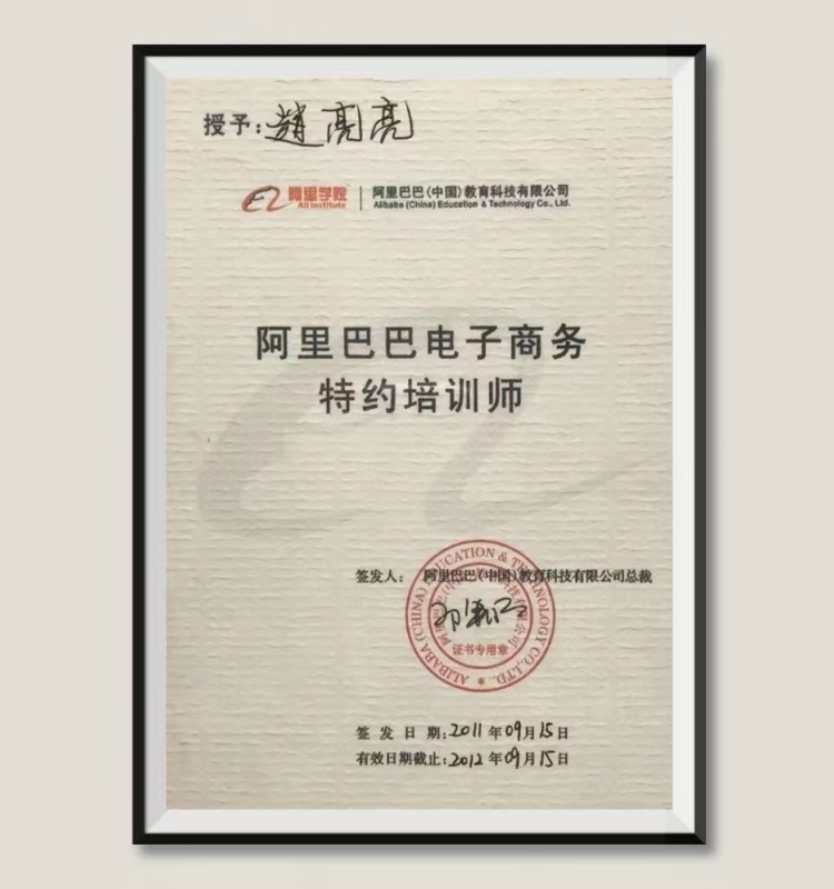赵亮亮老师受“阿里巴巴(中国)教育科技有限公司”邀请,担任阿里巴巴电子商务特约培训师一职,丰富的经验让他收获了出色的成绩,也在育人的道路上乐于奉献,以德育人。