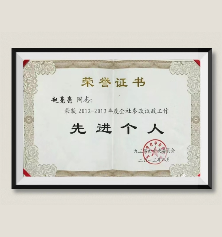 赵亮亮老师获得由九三学社中央委员会颁发的2012-2013年度全社参政议政工作“先进个人”荣誉称号,赵老师以扎实的专业知识、卓越的领导能力和超强的判断力,成为了业界公认的行业专家。