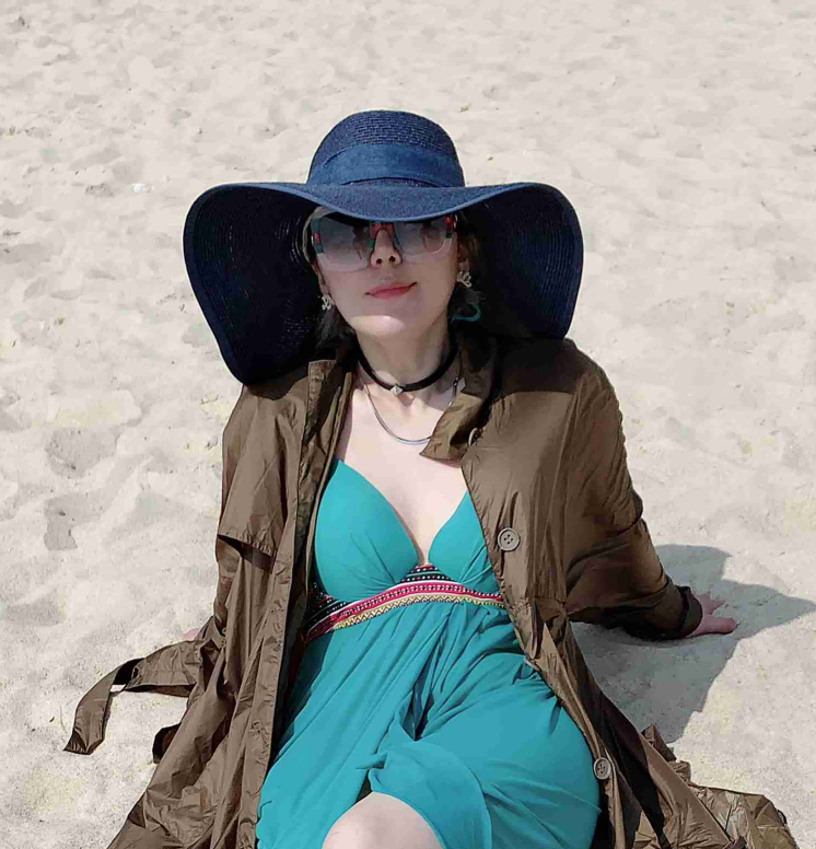 黄胜男老师戴着一副时尚的墨镜,站在蔚蓝的海边,阳光下镜片闪烁着神秘而迷人的光泽,她身穿轻盈的衣物,随风摇曳,与海浪的节奏相呼应,展现出一种悠然自得、不受拘束的海边度假风情。