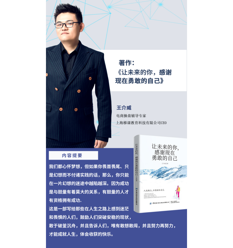 《让未来的你感谢现在勇敢的自己》,王介威老师这本书写给那些在人生之路上感到迷茫和畏惧的人们的书,鼓励人们突破安稳的现状,敢于破釜沉舟,并且告诉人们,与其担心明日,不如勇敢一次。