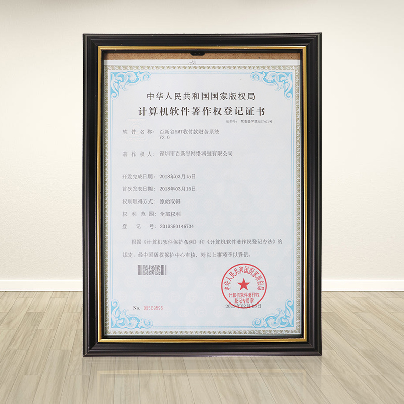 深圳市百新谷网络科技有限公司,百新谷SMT收付款财务系统V2.0软件通过审核,获得中华人民共和国国家版权局下发的——《百新谷SMT收付款财务系统V2.0软件计算机软件著作权登记证书...