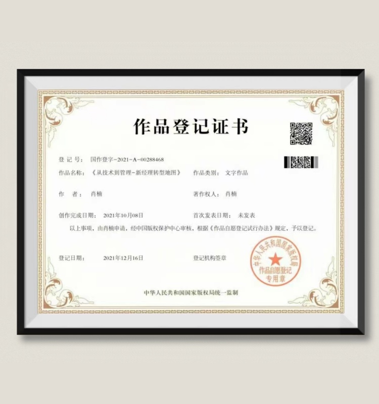 畅销书作家肖楠老师文字作品——《从技术到管理-新经理转型地图》由肖楠老师申请,经中国版权保护中心审核,根据《作者自愿登记试行办法》规定,由中华人民共和国国家版权局下发证书。