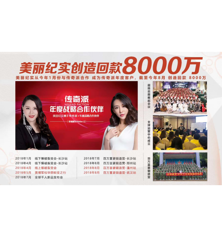 李婉卿老师年度战略合作伙伴——美丽纪实品牌创造回款8000万,作为传奇派年度客户,与李婉卿老师一起合作多次线下爆破裂变会、新品发布会、百万富豪锻造营,打造出强势团队。