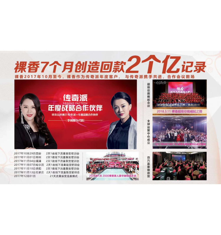 李婉卿老师携手年度战略合作伙伴——裸香7个月创造回款两个亿记录,裸香作为传奇派年度客户,合作会议数场,帮助了裸香团队的运营、培训、团队经营打造等方面做了全面的指导与帮助。