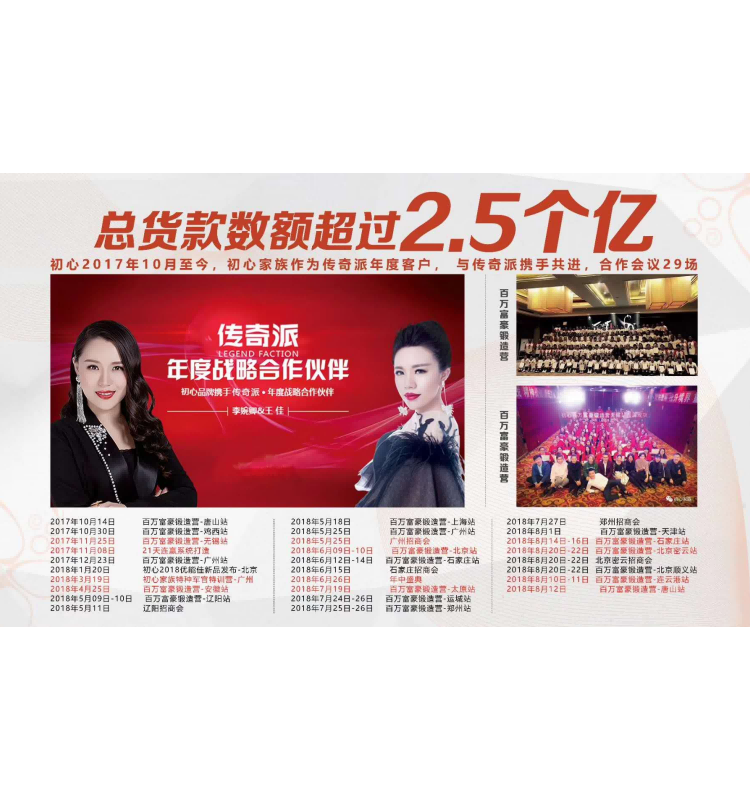 李婉卿老师年度战略合作伙伴初心家族,在全国多个城市地区合作百万富豪锻造营、招商会、新品发布会等会议共计29场,团队收效得到了喜人的成绩,总贷款数额超过2.5个亿。