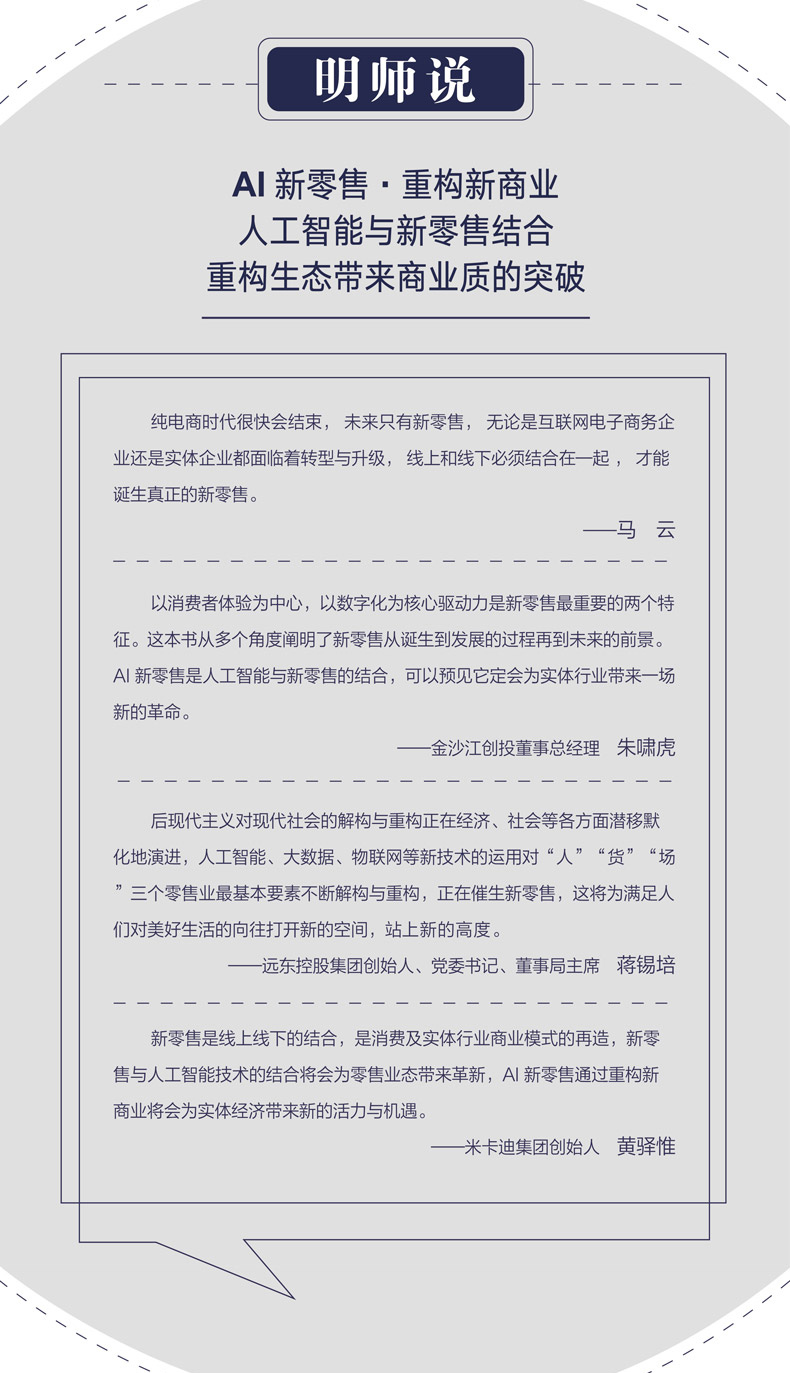 陈顺军:《AI新零售重构新商业》AI全面实现与消费者关系的重构,实现场景革命,数据赋能,催生各种零售新物种,并引导商业业态、商业模式、供应链、商业流通走向更高效的形态。