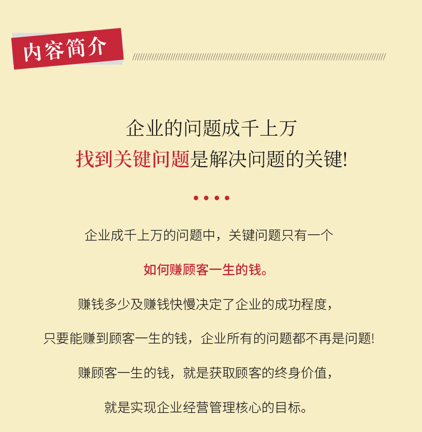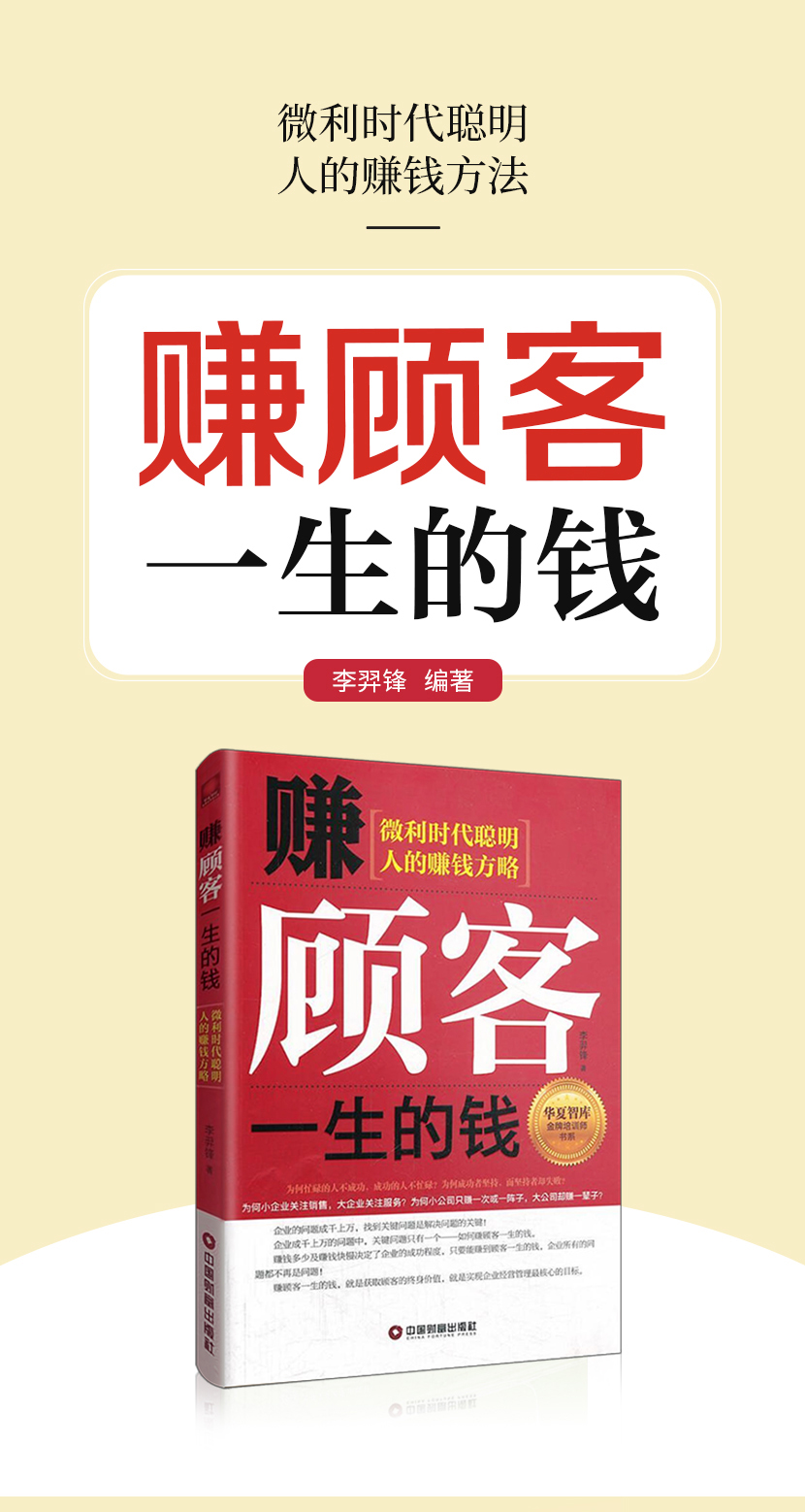 :《赚顾客一生的钱》企业所有的问题都不再是问题! 赚顾客一生的钱,就是获取顾客的终身价值,就是实现企业经营管理最核心的目标。