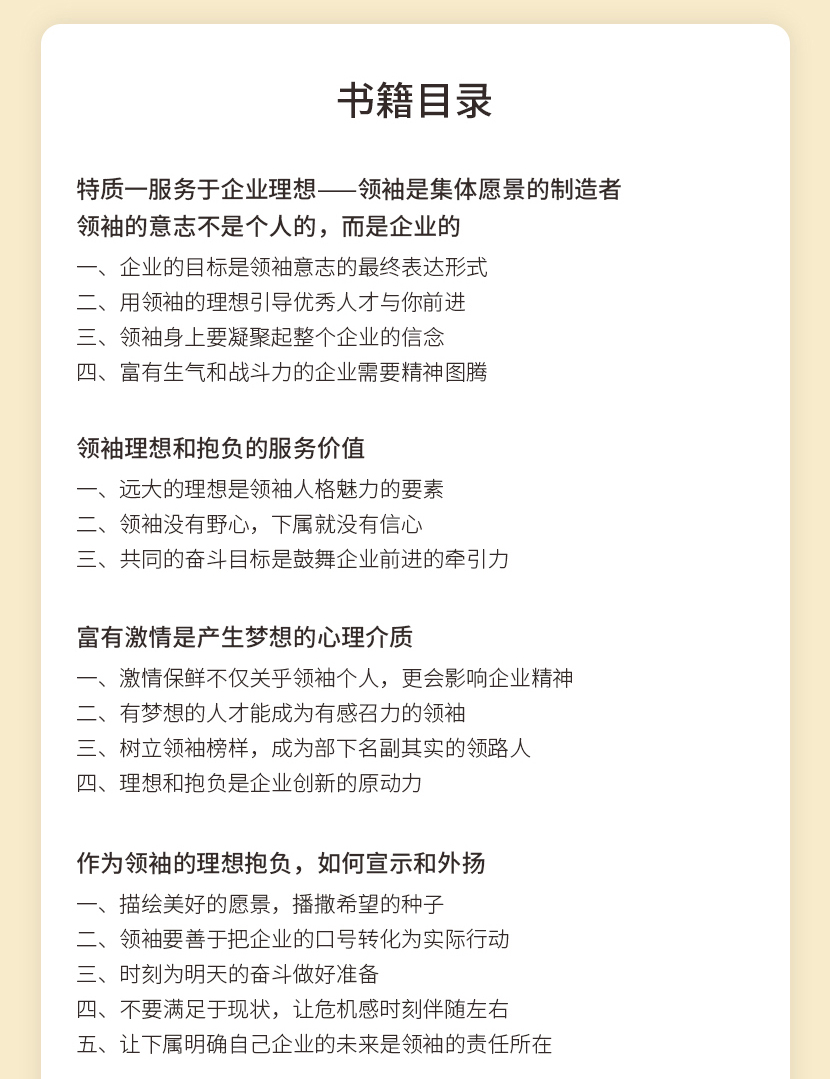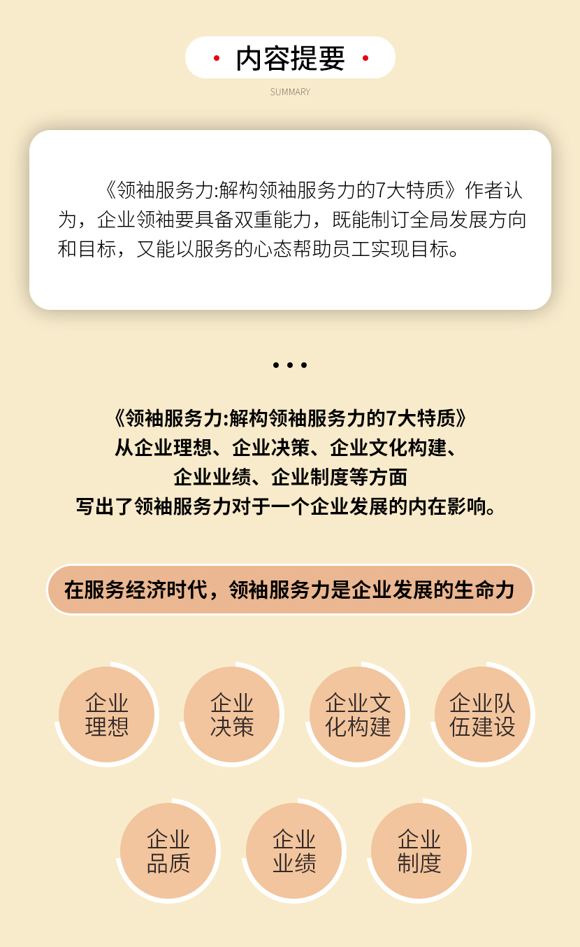 :《领袖服务力》从企业理想、企业决策、企业文化构建、企业队伍建设、企业品质、企业业绩、企业制度等方面点出了服务力对于一个企业的发展的内在影响。