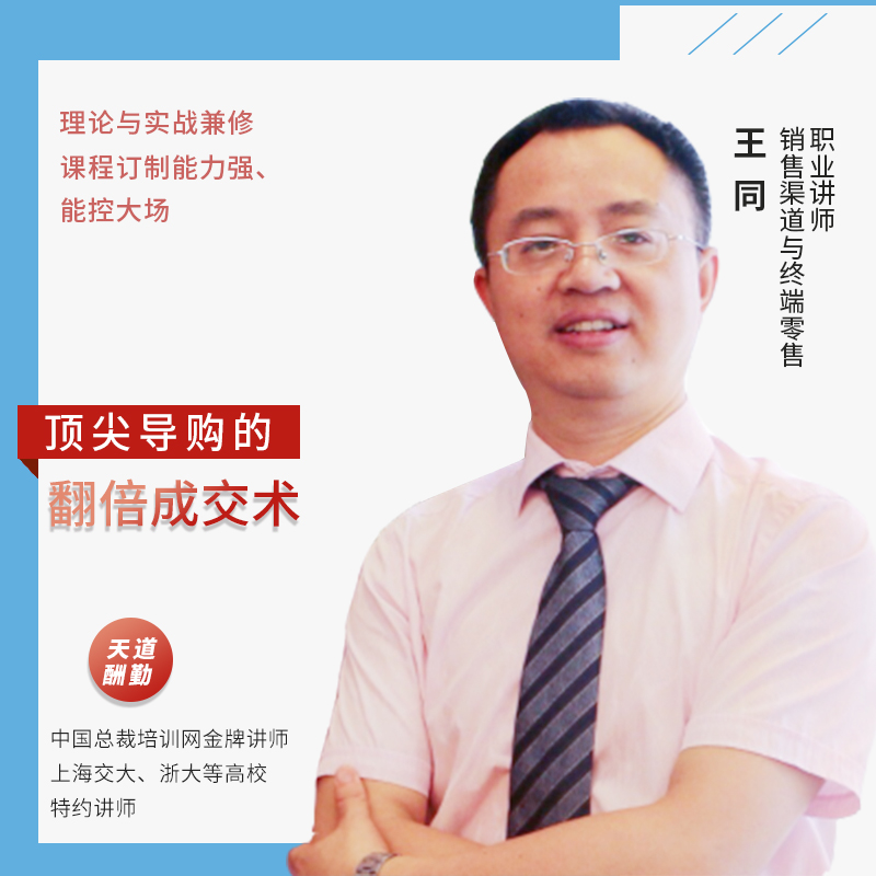 王同 【行业背景】销售渠道与终端零售职业讲师;中国总裁培训网金牌讲师;上海交大、浙大等高校特约讲师;【职业经历】理论与实战兼修:中国人民大学02届MBA,曾服务华润雪花啤酒6年,咨询培训12年。王同老师一直活跃在培训领域,已服务过蒙牛、恒安、美的、九阳、欧莱雅、劲霸、惠达等数百家的企业内训。经销商大会主讲老师、课程订制能力强、能控大场、轮训项目主讲老师、数百家内训客户以及众多回训客户的见证。