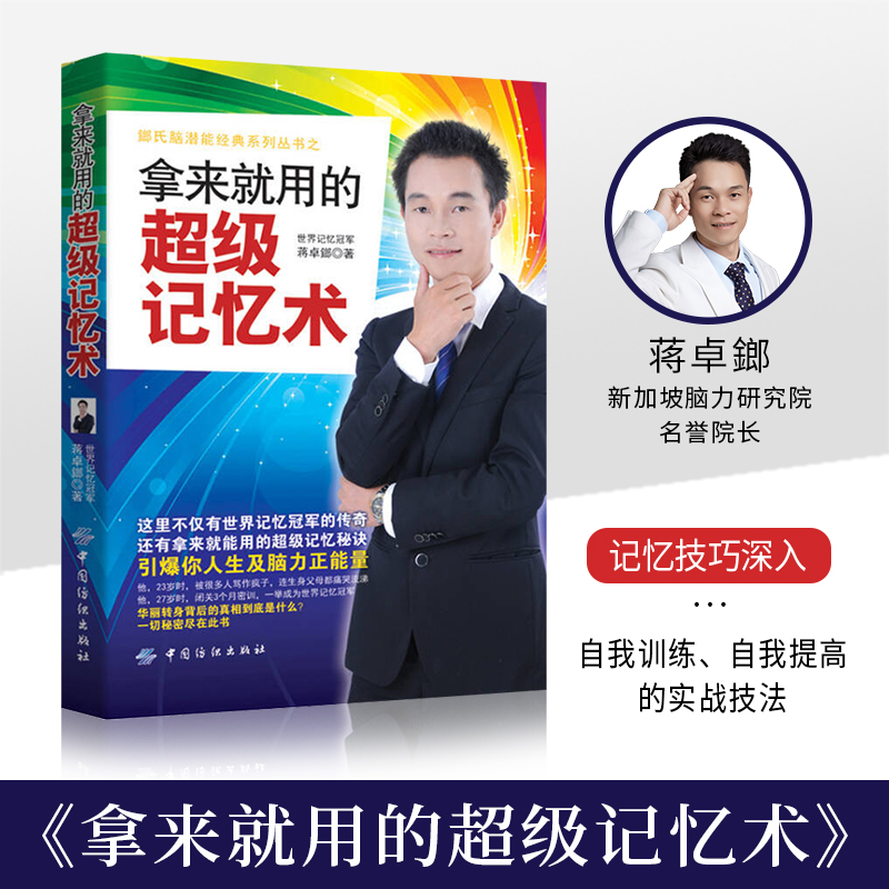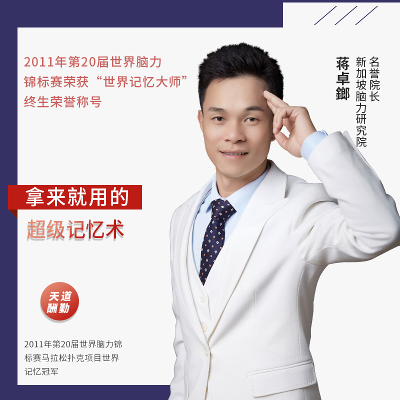本书舞台上选手们令人望尘莫及的震撼表演,其背后到底是惊人的天赋还是后天训练的成果?翻开这本书你就可以找到答案!本书对记忆学领域中核心的训练内容进行了详细讲解,包括连锁故事法、图像定位法、数字密码、记忆宫殿等,并对各种记忆术在生活中的具体运用也作了举例说明,甚至还有世界脑力锦标赛的训练内幕和本书的幕后故事。作者通过他的亲身实践,以□实的语言,将大师们神乎其技的高难记忆技巧深入浅出地娓娓道来,为读者打造了一套自我训练、自我提高的实战技法,数以万计的教学案例证明这套方法简洁而有效!只要按照世界记忆冠军蒋卓鎯老师的悉心指导勤加练习,你一定能成为拥有强大脑的记忆高手。