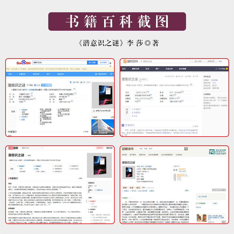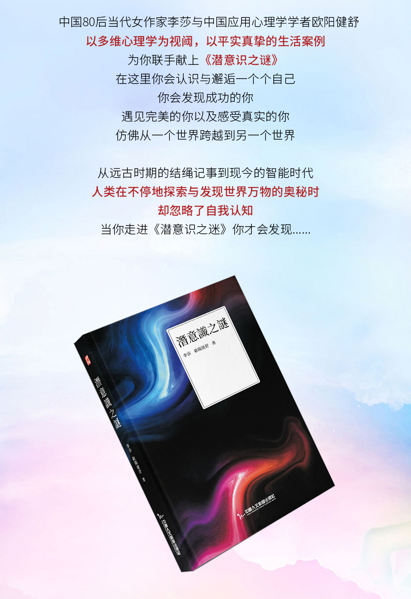 李莎:《潜意识之谜》——在这里你会认识与邂逅一个个自己,你会发现成功的你、遇见完美的你,仿佛从一个世界跨越到另一个世界,从经历到梦想,发现潜意识的宝藏,发现自己。