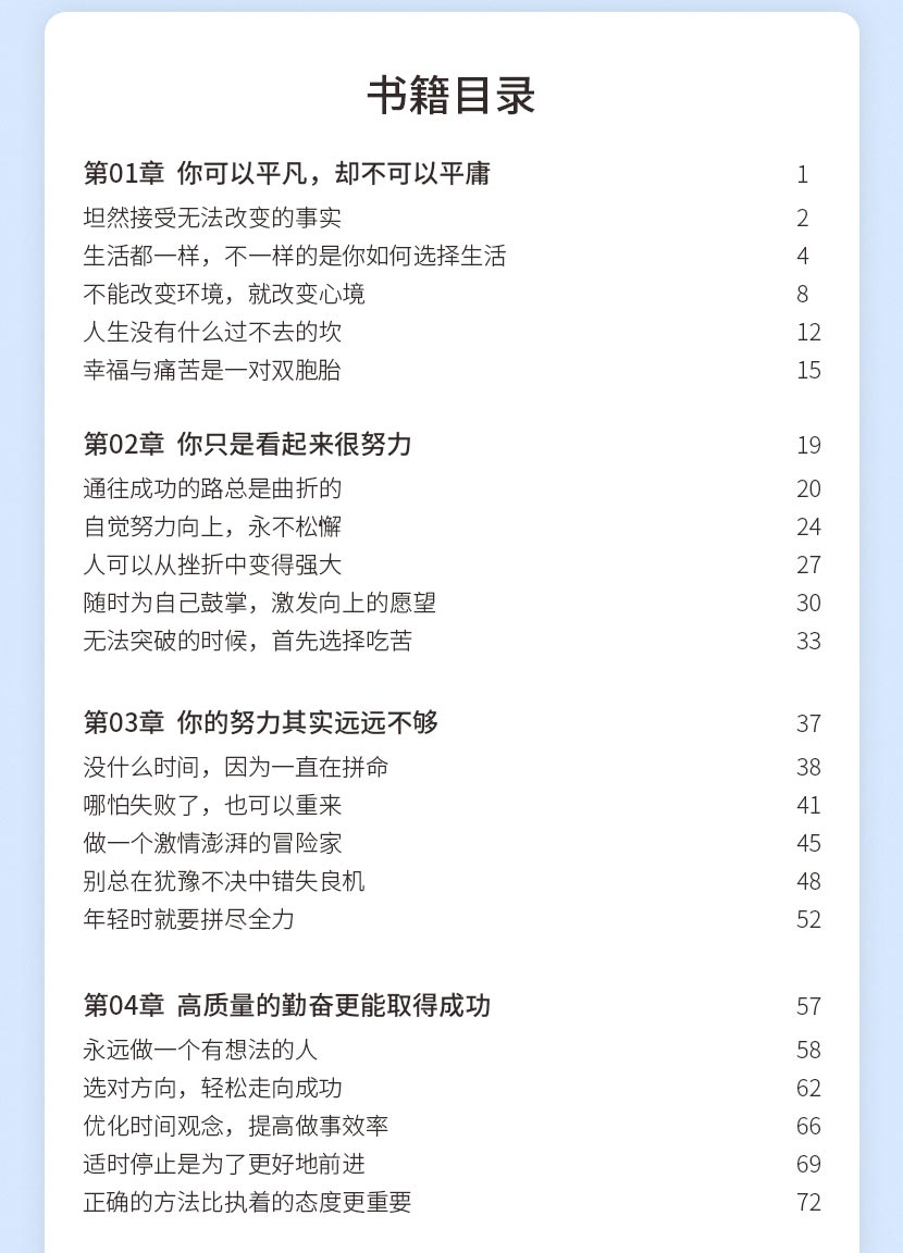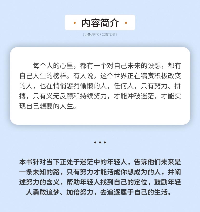 《努力成为你想成为的人》本书针对当下正处于迷茫中的年轻人,告诉他们未来是一条未知的路,只有努力才能活成你想成为的人,并阐述努力的含义,帮助年轻人找到自己的定位,鼓励年轻人勇敢追梦。