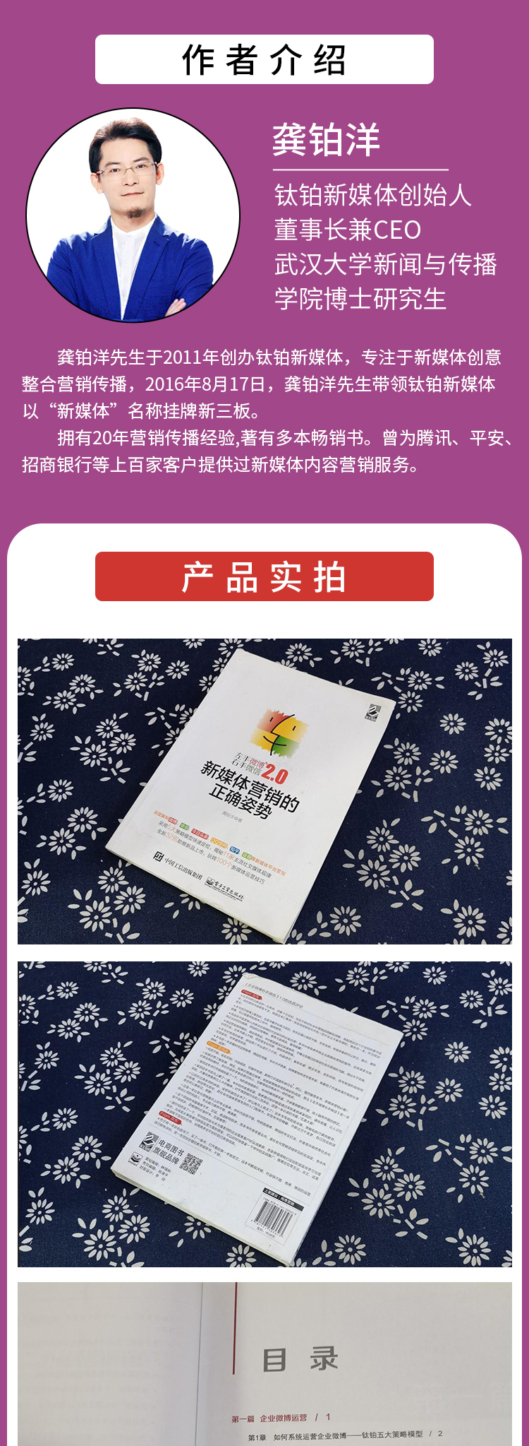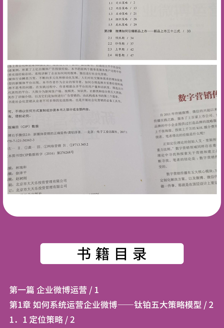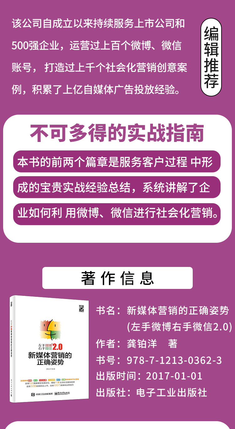 :《新媒体营销的正确姿势》本书的前两个篇章是服务客户过程 中形成的宝贵实战经验总结,系统讲解了企业如何利 用微博、微信进行社会化营销。