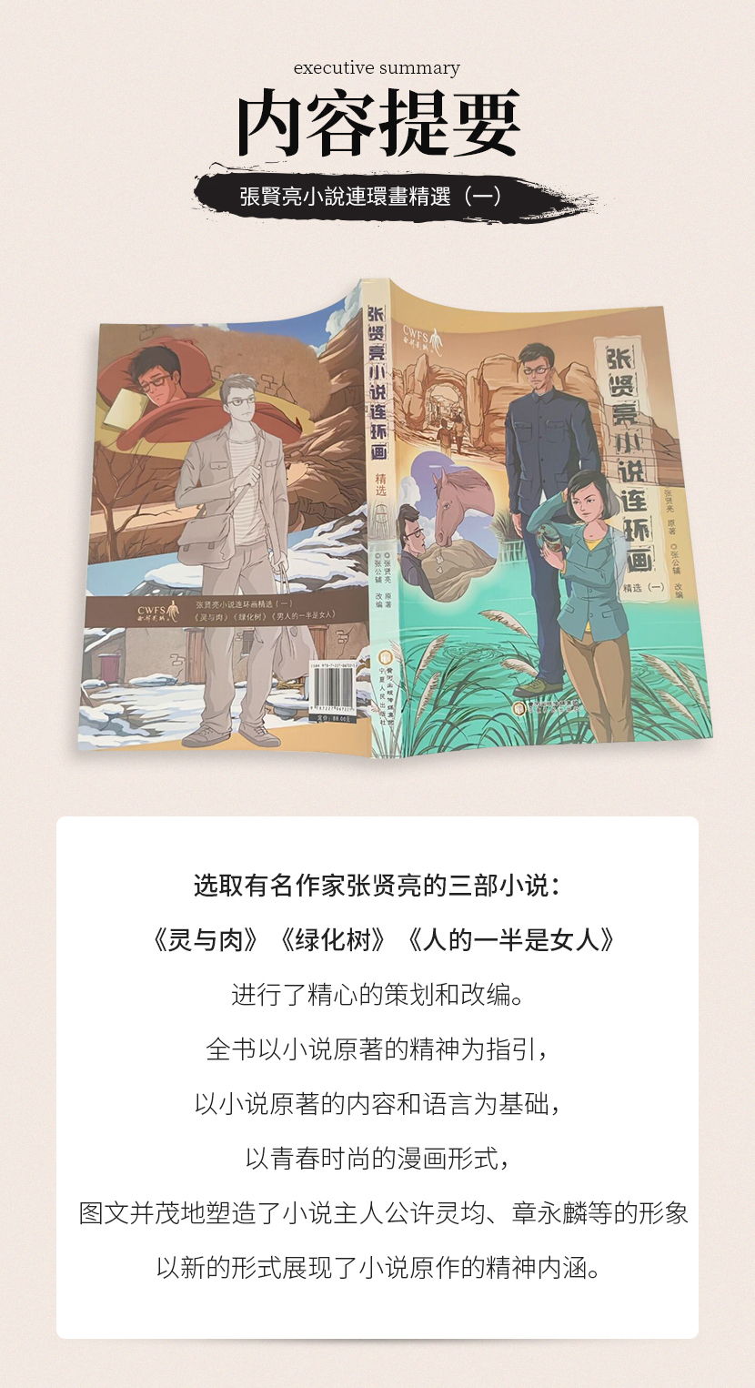 《张贤亮小说连环画精选》——以有名作家张贤亮的原著精神为指引,青春时尚的漫画形式,图文并茂地塑造了主人公的形象,以新的形式展现了小说原作的精神内涵