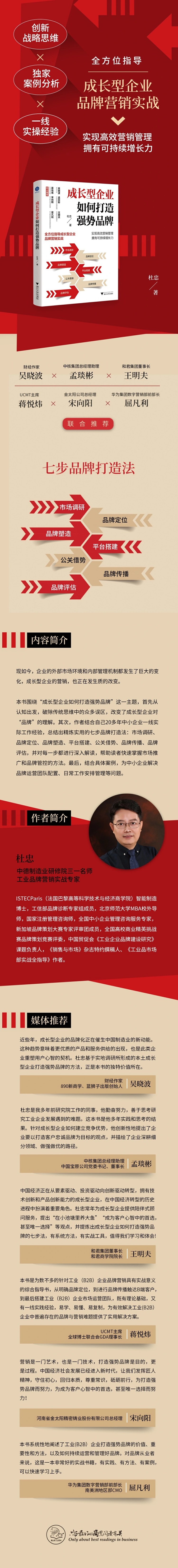 杜忠:《成长型企业如何打造强势品牌》——本书从企业市场营销内外部环境变化和趋势入手,先从认知上改变中小企业对“品牌”的理解,破除传统思维中的众多误区,帮助读者快速掌握市场推广和品牌管控的方法。