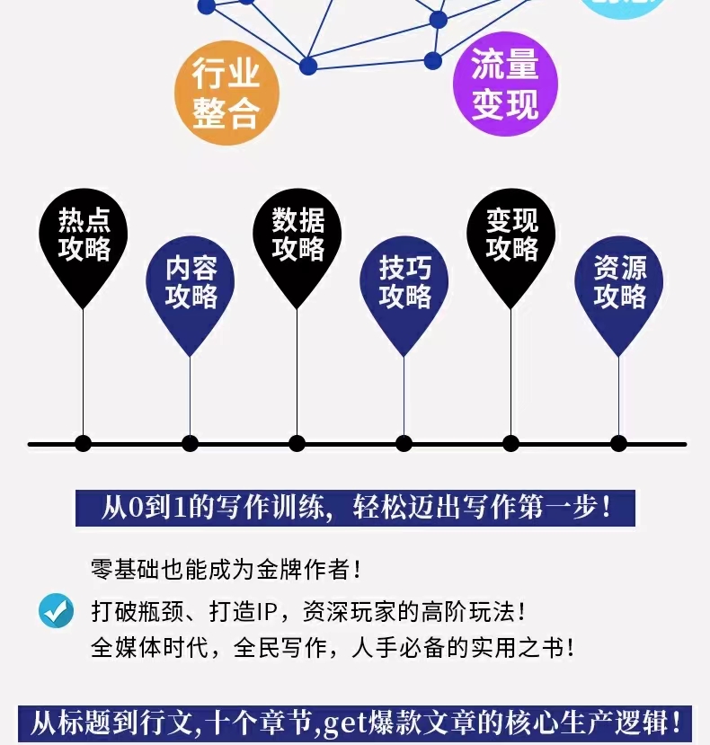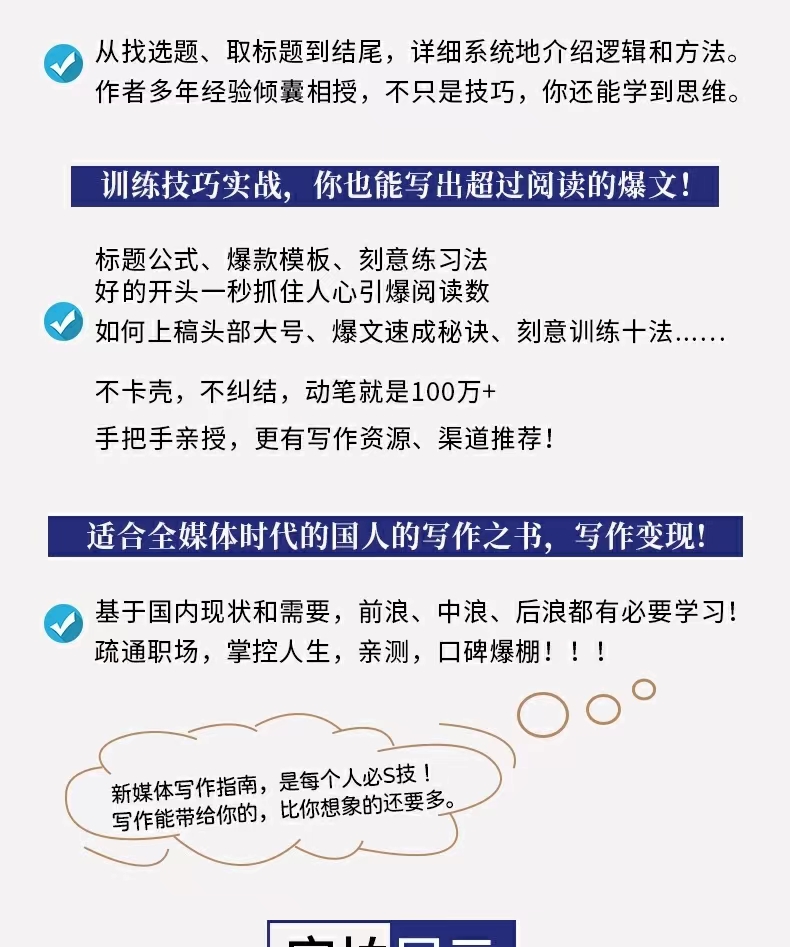 《零基础新媒体写作指南》——本书作为典型的干货工具书,这本书结构清晰明了,内容充实,帮助读者总论了解平台特性及找到适合自己的定位,新媒体写作创作如何写标题、搜集素材、随时写作、突破写作瓶颈期、利用读书写作,以及如何在新媒体环境下打造个人影响力IP,盘活粉丝,写书,做内容创业。
