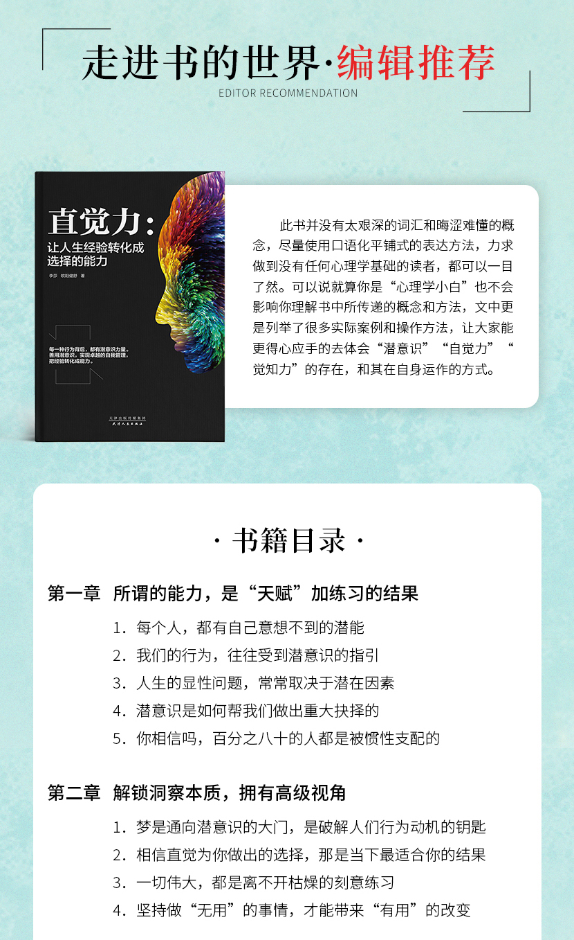 《直觉力:让人生经验转化成选择的能力》——在人类历史中,自我探索和认知一直是一个永恒的课题,本书带领大家以更轻松平和的方式了解潜意识,更得心应手的去体会它的存在。