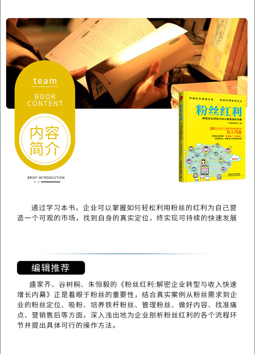 :《粉丝红利》总结了小米、微信等成功的互联网企业经营粉丝的方法,教会企业如何抓住客户的心理,将客户变成粉丝,如何维护好粉丝,如何通过粉丝的力量进行营销和品牌的建设。