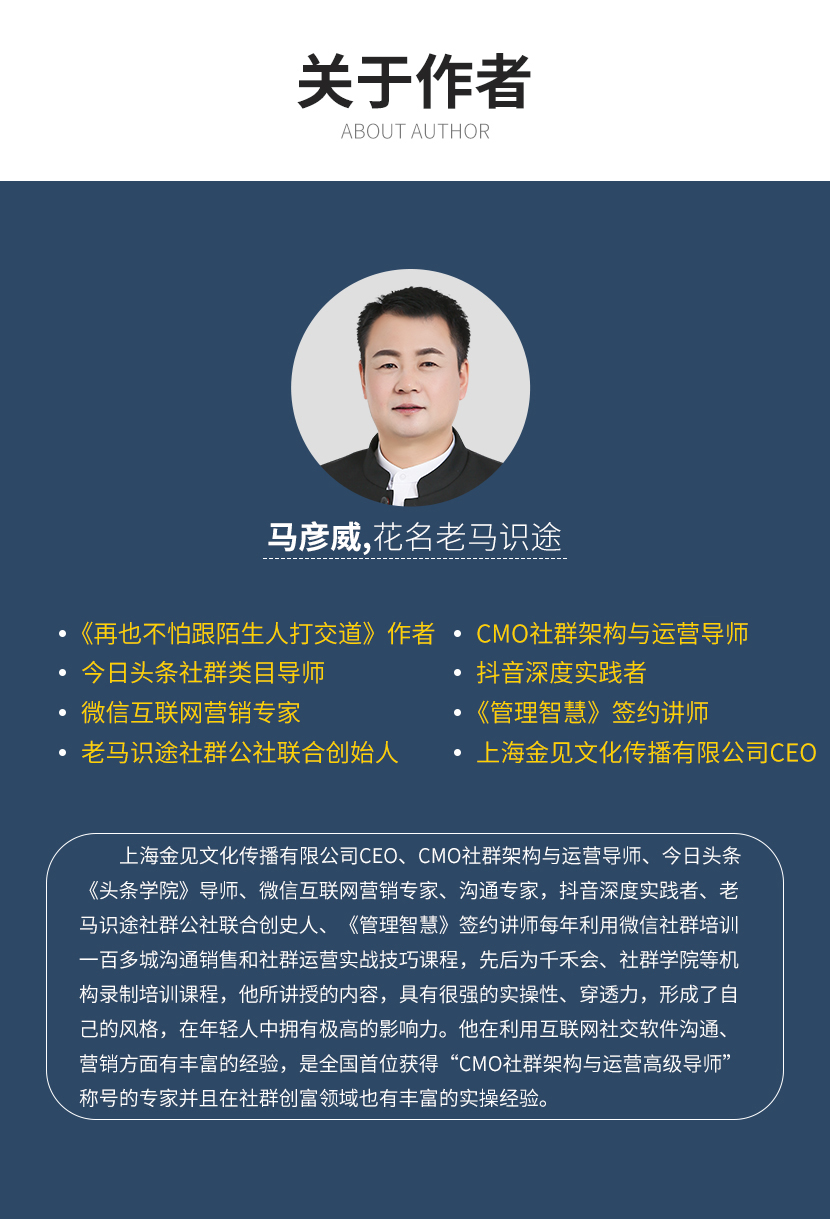 今日头条社群类目导师; 《管理智慧》签约讲师; 千聊平台《老马识途抖音自媒体培训》创始人; 《再也不怕跟陌生人打交道》作者。