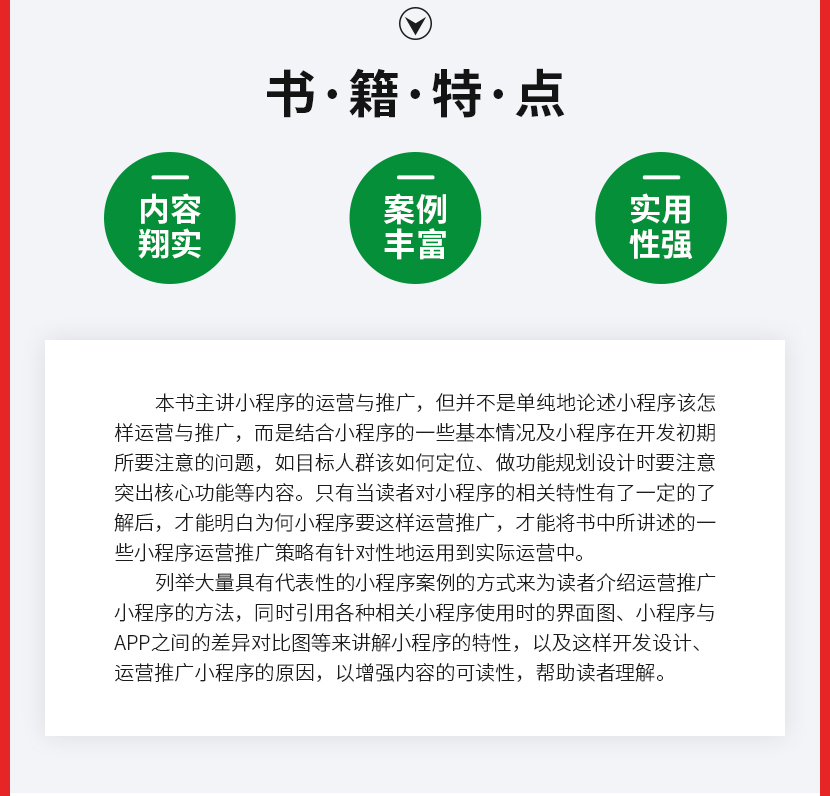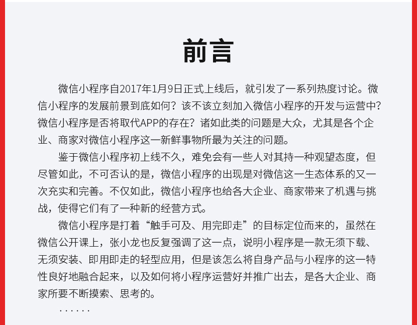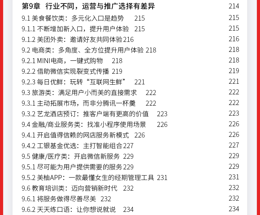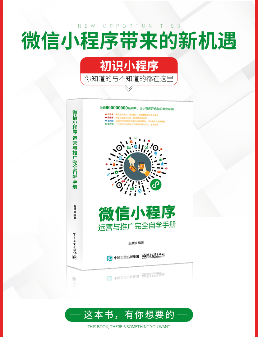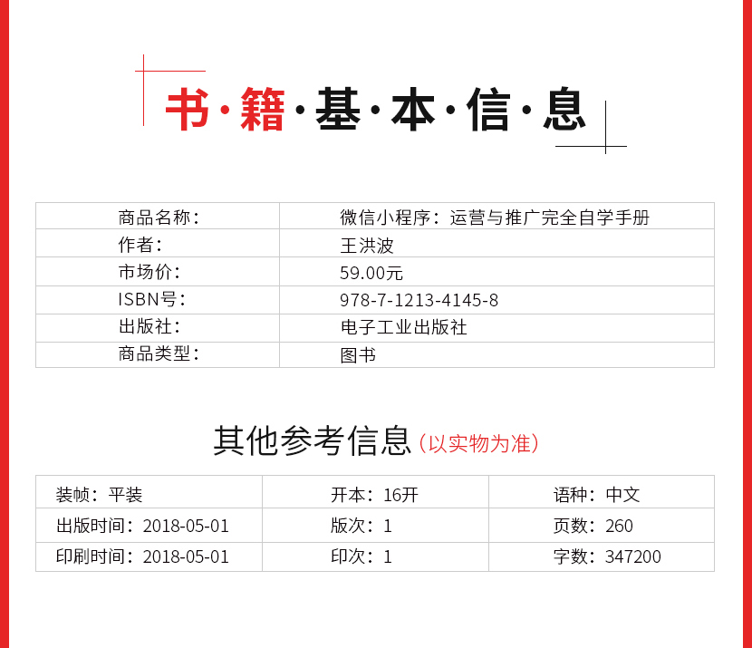 :《微信小程序:运营与推广完全自学手册》让读者认识小程序到底是什么;接着从小程序的盈利模式定位、目标人群定位、功能模块规划、营销策略、小程序推广玩法及工具、运营及推广效果评估等方面。