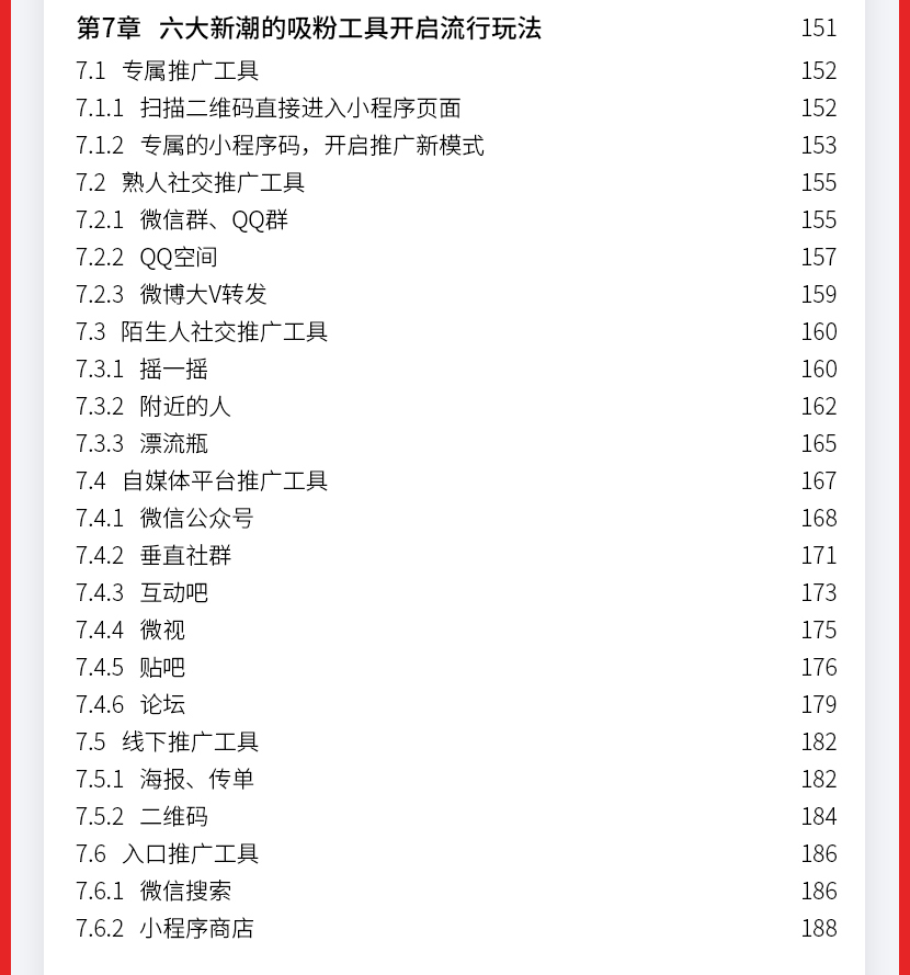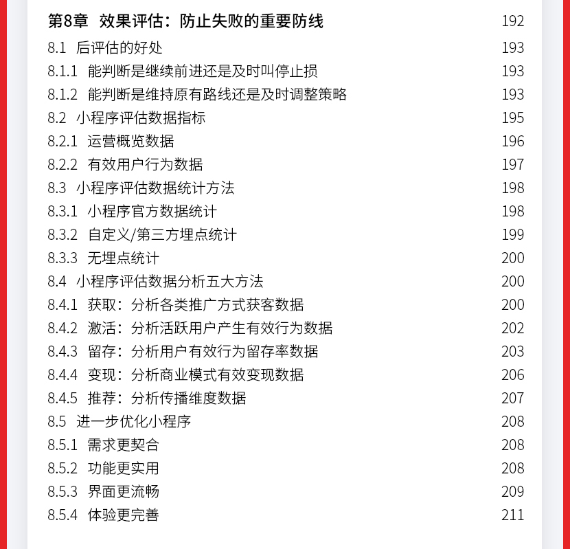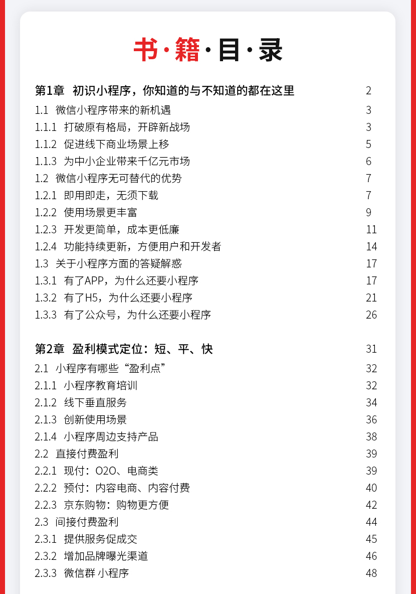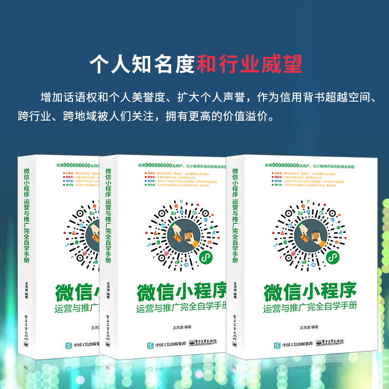 :《微信小程序:运营与推广完全自学手册》让读者认识小程序到底是什么;接着从小程序的盈利模式定位、目标人群定位、功能模块规划、营销策略、小程序推广玩法及工具、运营及推广效果评估等方面。